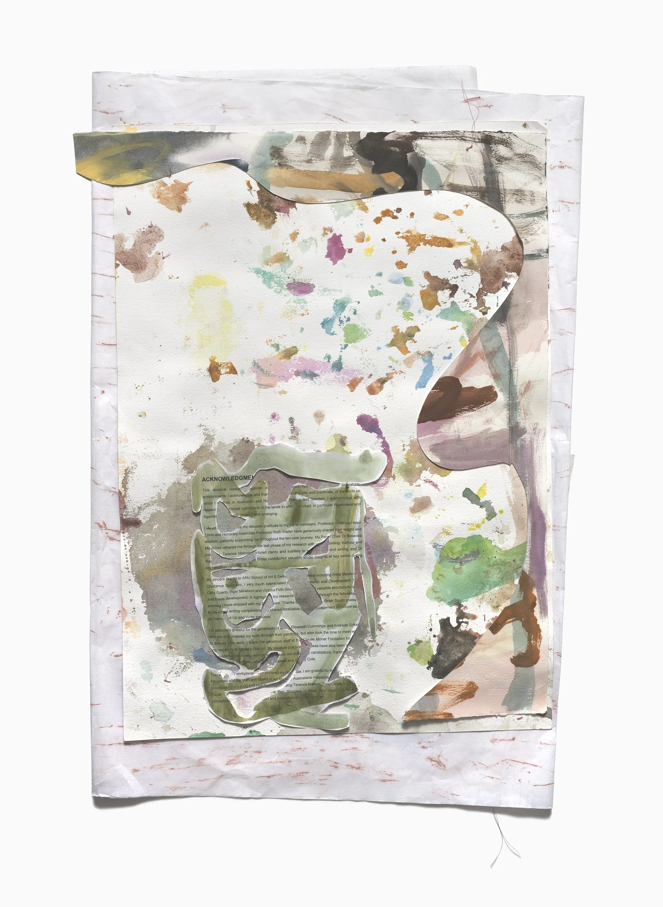 Across time, 30 years on from my first solo exhibition at Contemporary Art Space (Platform) In the garden. Time passes continues a dialogue with the core construction blocks of landscape representation – colour, form, movement, materiality. Rather than employing them to create pictorial landscape painting I use these tools to convey physical experiences within our natural ecosystems. In ephemeral collages I stitch together ideas and questions I have about gardens. How are these layers of paper accumulations of undergrowth and underground? Are the painted fragments tacked to the scratched wooden board a map of a garden’s composition from above? Rubbings of tree bark on large sheets of washi paper made in a Japanese cedar forest are folder over and over. They are covered in part by thicker paper on which colourful lines dash and meander, and mono-printed blotches of paint spread densely, all sewn through with fine cotton thread. Instead of creating illusion these materials, colours, marks and compositions map out relationships of matter, movement, living interactions, time and space that I experience in the garden.